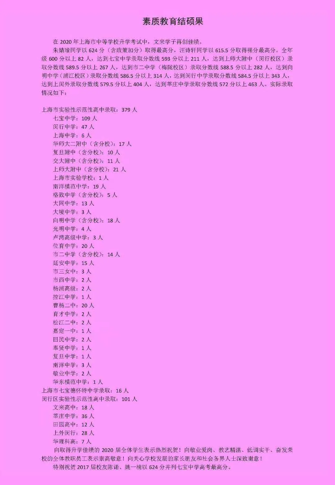 含政策加分最高分624分,裸考最高分615.5分。600分以上82人,达到七宝中学录取分数线593分以上211人,达到上师大附中(闵行校区)录取分数线589.5分以上267人,达到市二中学(梅陇校区)录取分数线588.5分以上282人……实际被上海市实验性示范性高中录取379人。