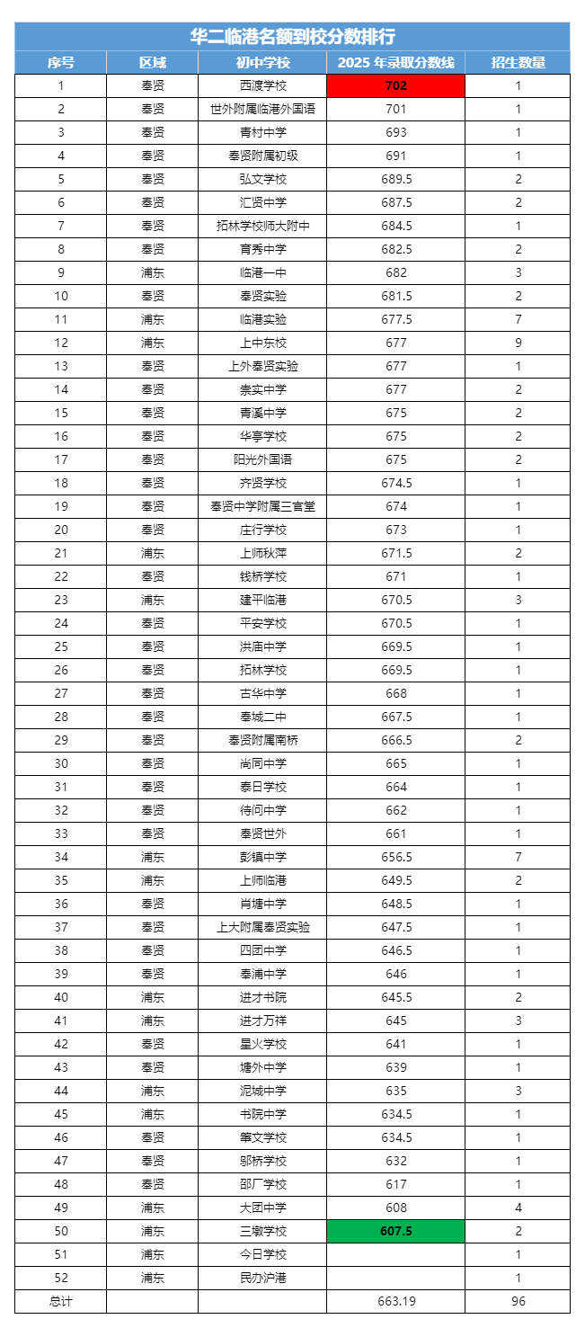 华二临港名额到校最高是西渡学校的702分,最低是三墩学校的607.5分,差值94.5分。
