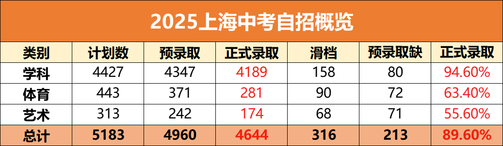 先给大家捋2025年自招数据和新变化:名额多了,但录取更难了! 今年全市96所高中(含体育、艺术骨干)自招计划共5183人,最终预录4960人,正式录取4644人。 有意思的是,预录和实际录取之间差了309人,总完成率只有89.8%。 虽然名额看起来多了,但实际录取率反而比去年还低了0.82%。