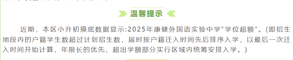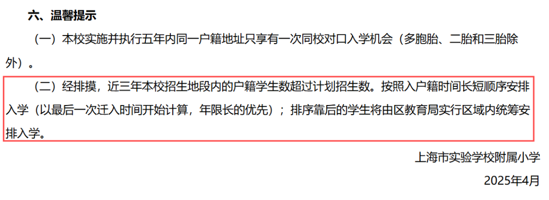 经排摸,2025学年我校“学位超额”(即:招生地段内的户籍学生数超过计划招生数)。所以,按照入户籍时间长短顺序安排入学(以最后一次迁入时间开始计算,年限长的优先),排序靠后的学生将会被统筹至周边有学额的学校。