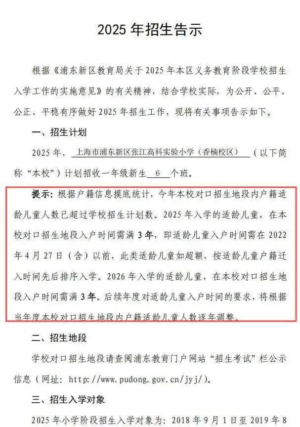 根据户籍信息摸底统计,今年本校对口招生地段内适龄儿童人数已超过学校招生计划数。25年入学入户时间需满3年,2026年入户时间需满3年。