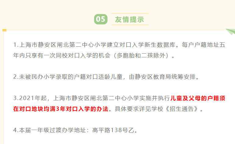 2021年起,上海市静安区闸北第二中心小学实施并执行儿童及父母的户籍须在对口地块均满3年对口入学的办法。具体要求详见4月11日统一发布的《招生通告》。