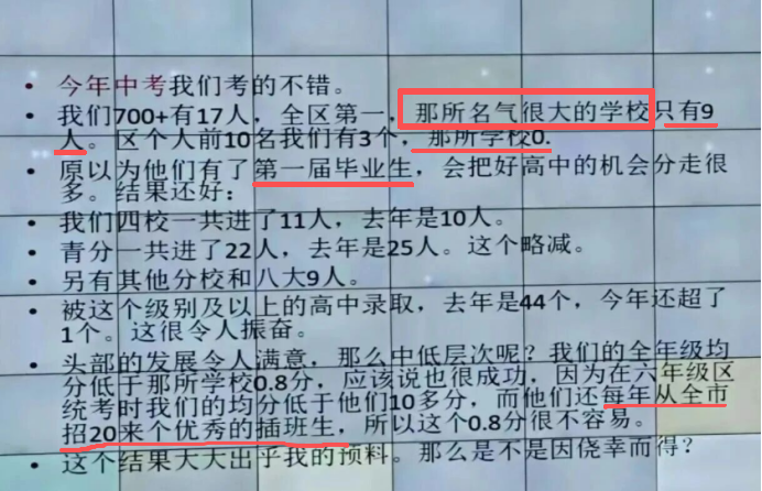 了解清楚两所学校的“出身”和渊源之后,我们再把目光转回到家长会的那张PPT,进行详细分析。
