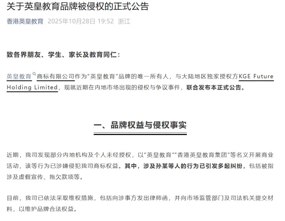 知名连锁巨头爆雷? 这家被传跑路的DSE机构,是英皇教育DSE。 据了解,这家机构在内地有5个校区,分布在北京、上海、广州、深圳、成都这几个一线城市。 其中上海校区就在徐汇区漕溪北路,而这次爆雷,上海校区也牵涉在内,上海家长表示,机构老师10月11日还在发教学广告,有的学生在机构还有3万-5万不等,累计十几万的学费...... 上海一位家长称,孩子缴纳的18万元“三年直通班”学费仅上3个月课,机构承诺的“香港名校保录取”成空谈,退费电话无人接听。 其他城市的校区也不能幸免,深圳校区家长表示,因为老板欠房租被房东赶走,学生和老师连教室都没了。 甚至连供应商都被坑,多家印刷商说:“三个月教材印刷费,一万多块钱,催了十次没人理。” 有员工揭露,内部有人利用职务私下卖保录项目,向家长承诺保上香港名校,实际上根本不存在。 还有人借公司名义做别的生意,从中赚取佣金。 但离谱的事情还不止这些...... 真香港英皇下场打假 事发几天后,香港英皇教育发布紧急声明,澄清自己没有授权内地任何机构,暴雷的竟然是假冒英皇品牌的冒牌货。 图源:香港英皇教育 英皇还公布了他们正式授权的合作机构名单,英皇方面强调: 除了官方公布的这些合作方,其他任何打着“英皇教育”名义招生、办学、宣传的机构或个人,统统都没有得到授权。 图源:香港英皇教育 简单来说,跑路的那家DSE机构,是冒牌的! 很多家长一开始以为是香港很有名的那个英皇教育,结果昨天正主出来辟谣发布公告,家长们才发现,这家“跑路”的机构只是名字相似的“山寨版”,甚至连logo都刻意模仿。 不少家长正是被“英皇”的名头误导才报了名。 (左:内地英皇教育;右:香港英皇教育) 直到老板跑路、机构关门,香港总部发出澄清,大家才发现自己原来被骗了。
