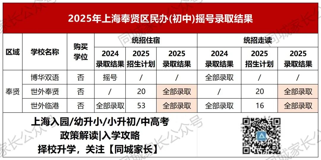 2025年,奉贤区2所民办小学招生,共计招生计划166人,报名人数小于或等于计划数,全部录取。(博华双语更名为世外学校,今年重新招生。)