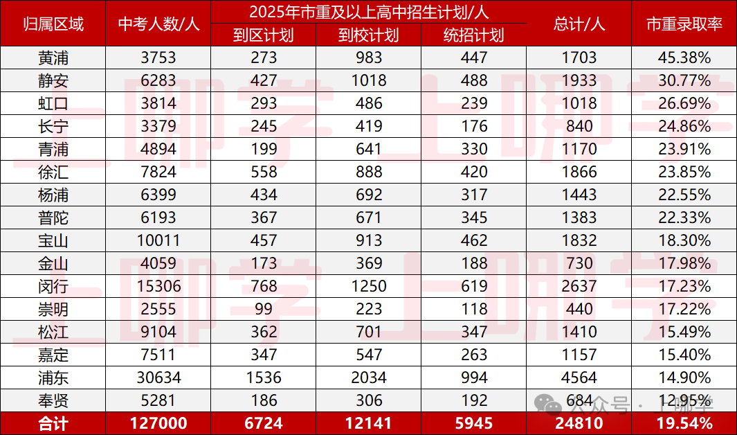 市重点录取比例最低的是奉贤区,市重点招生计划不多,中考人数不少;浦东也没好到哪里去,哪怕浦东市重点高中不算少,但架不住浦东人多呀。