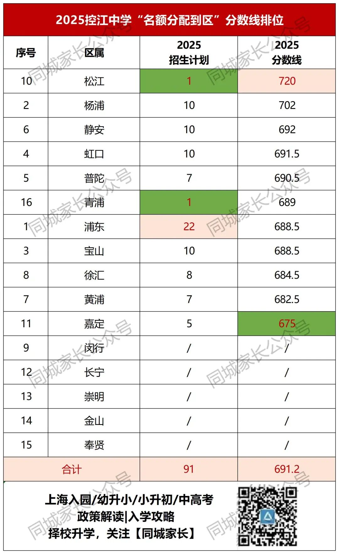 2025年控江中学到区投档分数线最低分数线:嘉定区(675分,不含综评50分),值得关注的是最高分数线出自:卷王松江(720分,不含综评50分)。