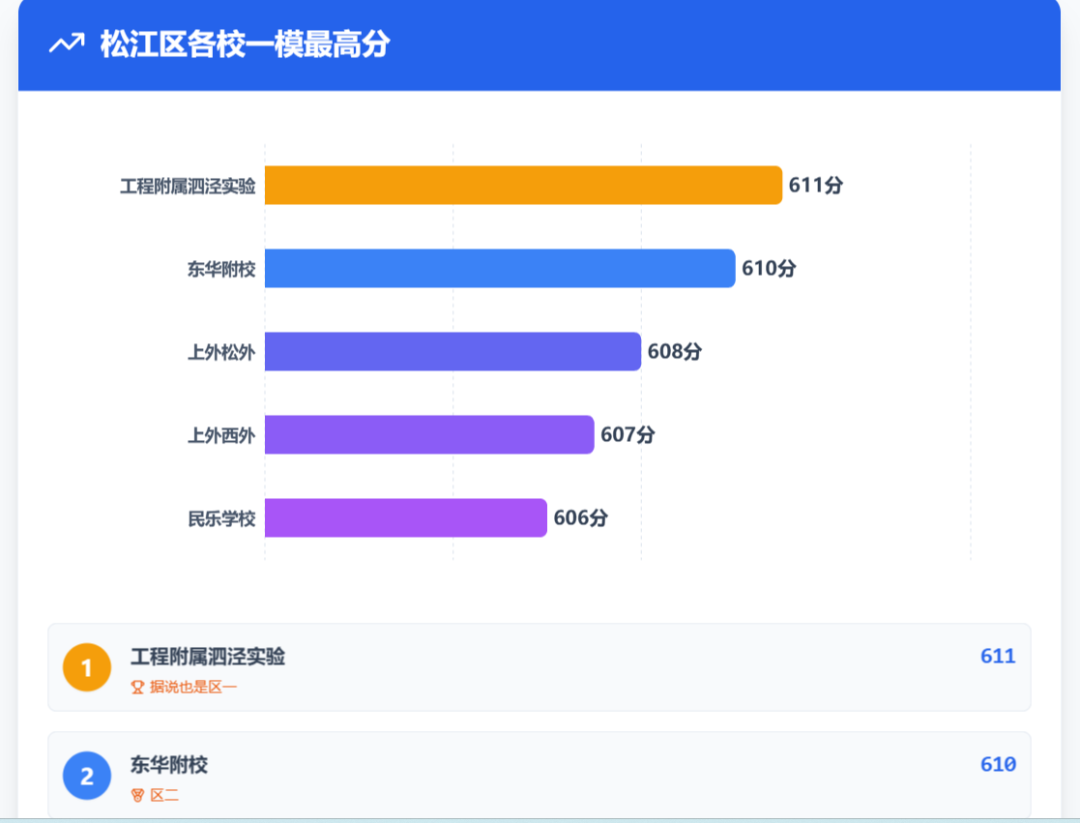 青浦的战局非常有意思,今年不仅是民办的内战,公办学校也有黑马。1、东方中学:最高分606.5,拿下区一!且有两个600+。这在公办学校里是非常炸裂的成绩。2、青浦世外:最高分606,均分全区第一。老大哥地位依然稳固。3、青浦兰生:最高分597.5,均分全区第二。值得一提的是,兰生在25届中考被五浦汇压了一头后,这次一模终于扳回一局,数学均分全区第四,道法全区第一。4、五浦汇:最高分598.3,均分这次不敌青浦兰生,不过也未跌出前三。青浦的格局正在发生微妙变化。青浦世外依旧领跑,但青浦兰生和五浦汇的缠斗进入白热化。让人惊喜的还有东方中学,给公办生源争了一口气。