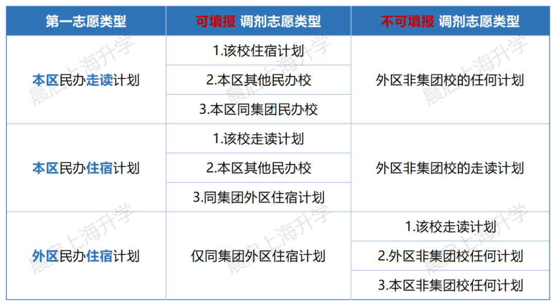 如果第一志愿的学校没有集团校,或者就算有集团校也没有住宿计划,那调剂志愿就只能选自己就读意愿区的民办学校了。