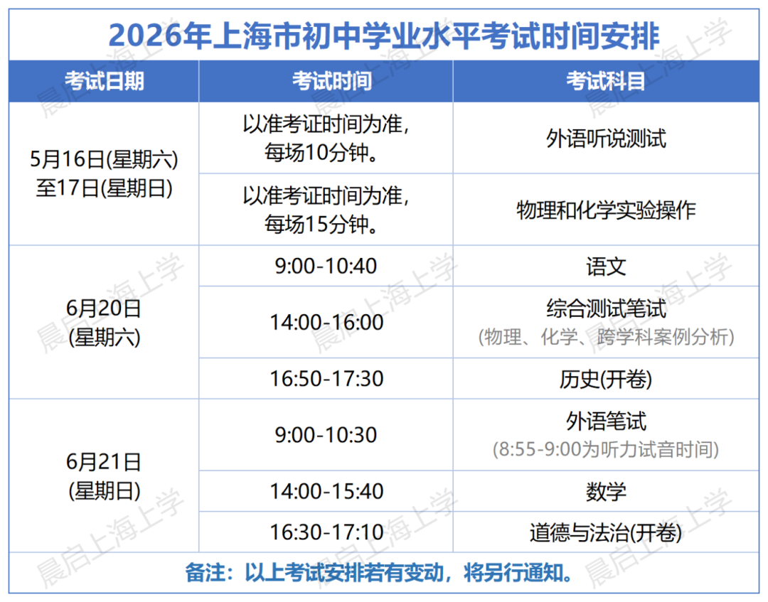 根据《上海市教育委员会关于印发<上海市初中学业水平考试实施办法>的通知》(沪教委规〔2023〕5号)、《上海市教育委员会关于2026年上海市高中阶段学校招生工作的若干意见》(沪教委基〔2026〕2号,以下简称《若干意见》)等,现就2026年上海市高中阶段学校考试招生工作提出如下要求: (一)考试安排 上海市高中阶段学校招生(以下简称“中招”)以初中学业水平考试(以下简称“学业考试”)语文、数学、外语、道德与法治、历史、体育与健身和综合测试(含物理、化学、跨学科案例分析、物理和化学实验操作)的成绩作为录取的基本依据,总分750分。 具体考试时间安排详见下方↓。 (二)考务组织 1.学业考试全部安排在标准化考点进行,按照国家教育考试的标准和要求规范组织考试。 2.回户籍地或居住证登记地址所在区参加中招报名(以下简称“跨区报名”)的学生,在学籍所在区参加学业考试。往届生、返沪生在报名所在区参加学业考试。 3.残疾学生参加考试可申请相应合理便利,相关要求和工作另行通知。 4.语文、数学、外语、道德与法治、历史5门科目统一考试和综合测试笔试实行全市统一网上评卷; 物理和化学实验操作考试评卷和其他科目考试评定工作由各区教育局组织实施。 评卷工作须切实做到安全保密、规范管理、统一标准、公平公正。 5.学生若对本人成绩有异议,可在成绩发布后的规定时间内,通过“上海招考热线”网站(www.shmeea.edu.cn,下同)申请成绩复核。 成绩复核主要核查答题纸姓名、报名号等是否与学生本人对应,试题有无漏评、漏阅,小题得分是否漏计,各小题得分合成后是否与提供给学生的成绩一致等,不重新评卷。 复核结果由市教育考试院通过“上海招考热线”网站反馈学生。 学生本人及家长(监护人)不可查阅试卷、答卷以及相关考试视频监控录像。 中招志愿填报在学业考试后、成绩发布前进行,由市、区招考机构共同组织,相关工作日程详见下方↓。 学生须在规定时间内登录“上海招考热线”网站进行志愿填报。 填报完成后,学生本人及家长(监护人)须进行志愿书面确认,其网上填报的志愿方可生效。 (一)自主招生志愿 自主招生志愿分为四个类别,均可兼报。 1.市实验性示范性高中、市特色普通高中自主招生(以下简称“市实验、市特色高中自招”):合计2个志愿,志愿不分先后。 2.市实验性示范性高中、市特色普通高中优秀体育学生、艺术骨干学生自主招生(以下简称“市实验、市特色高中体艺自招”):合计2个志愿,志愿不分先后。 填报该志愿的学生须是通过相关资格确认的学生,同时具备两类资格的学生可兼报。 3.国际课程班和中外合作办学高中自主招生:志愿填报由相关招生学校自行组织,无须在“上海招考热线”网站上填报。 4.中职校自主招生:设有中本教育贯通培养模式(以下简称“中本贯通”)、五年一贯制培养模式(以下简称“五年一贯制”)和中高职教育贯通培养模式(以下简称“中高职贯通”)、中职校提前招生(需面试或测试,以及需要市级优秀体育学生资格确认的专业,下同)三个类别,可兼报。 填报有面试或专业测试要求的志愿,学生应先报名参加并通过相关招生学校组织的面试或专业测试;填报中职校优秀体育学生专业志愿,学生须先通过相关资格确认。 中职校自主招生各类别志愿设置如下: 中本贯通:2个平行志愿。 仅限完成中招报名的上海户籍学生填报。 五年一贯制和中高职贯通:合计5个平行志愿。 中职校提前招生:3个平行志愿。 (二)名额分配综合评价志愿 名额分配综合评价志愿分为“名额分配到区”和“名额分配到校”两个类别,可兼报。 1.“名额分配到区”:1个志愿。完成中招报名的学生均可填报。 2.“名额分配到校”:2个平行志愿。 仅限不选择生源初中在籍在读满3年的应届初三学生填报。 学生填报资格由毕业学校认定,并须于补报名结束后公示5个工作日,公示无异议后报区教育行政部门备案。 往届生、返沪生及跨区报名的应届初三学生不能填报“名额分配到校”志愿。 (三)统一招生志愿 统一招生志愿分为“1至15志愿”和征求志愿,完成中招报名的学生均可填报。 区级优秀体育学生、艺术骨干学生资格确认由所在区的教育行政部门负责并公示。 通过资格确认的区级优秀体育学生、艺术骨干学生可在“区级优秀体育学生、艺术骨干学生”志愿栏内填报1个志愿。 “1至15志愿”未被录取的学生,由区招考机构负责在有剩余招生计划的学校或专业中进行征求志愿填报。 (四)其他说明 1.填报志愿时,学生须仔细阅读各区中招实施细则和各招生学校的招生方案,根据各校招生计划、招生要求、住宿条件和收费标准等慎重填报。 请特别注意填报学校是本部还是分校或校区、招生代码(6位数)、学校属性(公办或者民办,高中或者中职校)等信息。 2.填报自主招生志愿的学生也应填报名额分配综合评价志愿和统一招生志愿。 若学生在自主招生录取批次被正式录取,其填报的名额分配综合评价志愿和统一招生志愿自然失效。 3.有身体条件及其他特殊要求的中职专业志愿,学生须符合相关要求才能填报。 若学生因不符合招生要求而被学校退档,则无法再被其他学校录取。 4.在“中职校提前招生”类别中,若个别专业因录取人数太少而无法成班,招生学校可根据学生志愿、计划及招生章程等,在