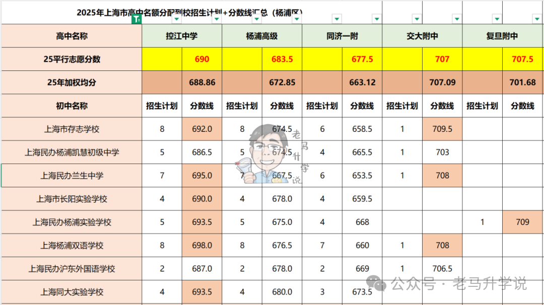 花时间整理了一下杨浦区中考2025年名额到校的录取情况,
