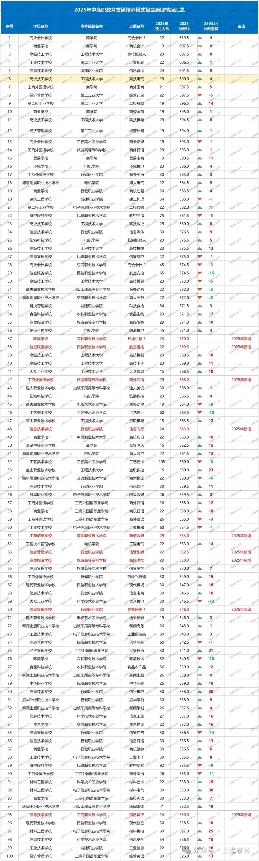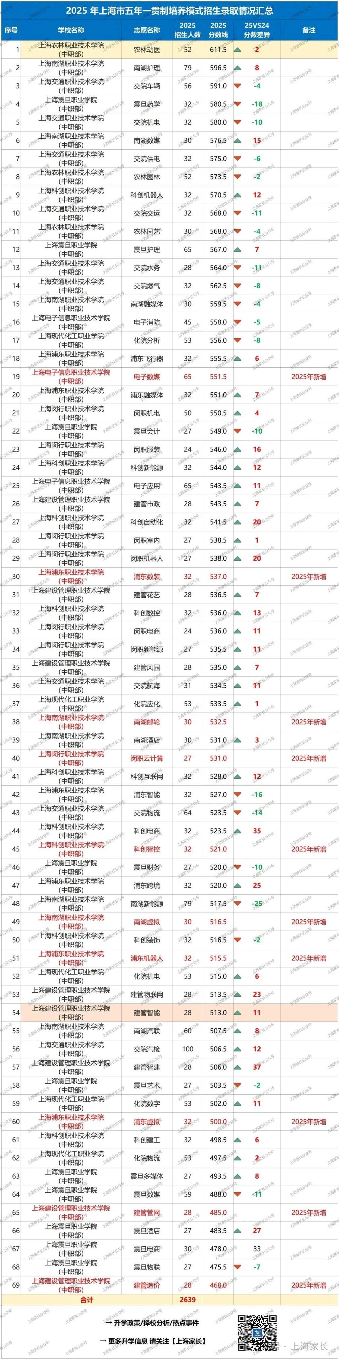 2025年中本贯通类型共76个专业招生: 招生计划:2025年共招2275人;相较于2024年扩招183人; 2025年中本贯通分数涨跌情况,38个专业投档分数线呈上涨趋势,1个专业持平,新增6个专业无对标,31个专业投档分数线呈下降趋势。 新增专业 上海2026年中考将增设40个中高贯通专业点。