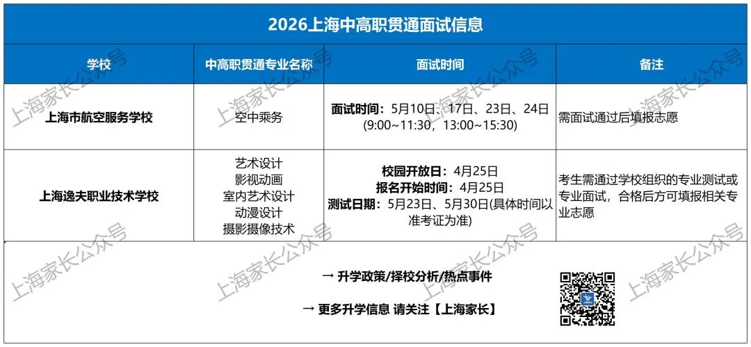 目前已经收集到上师大附属杨浦现代职业学校,航空服务学校,逸夫职业技术学校已经发布招生简章,这3所学校部分专业是需要面试的,有意向的同学记得在学校指定的渠道报名及参加面试噢~需要面试专业