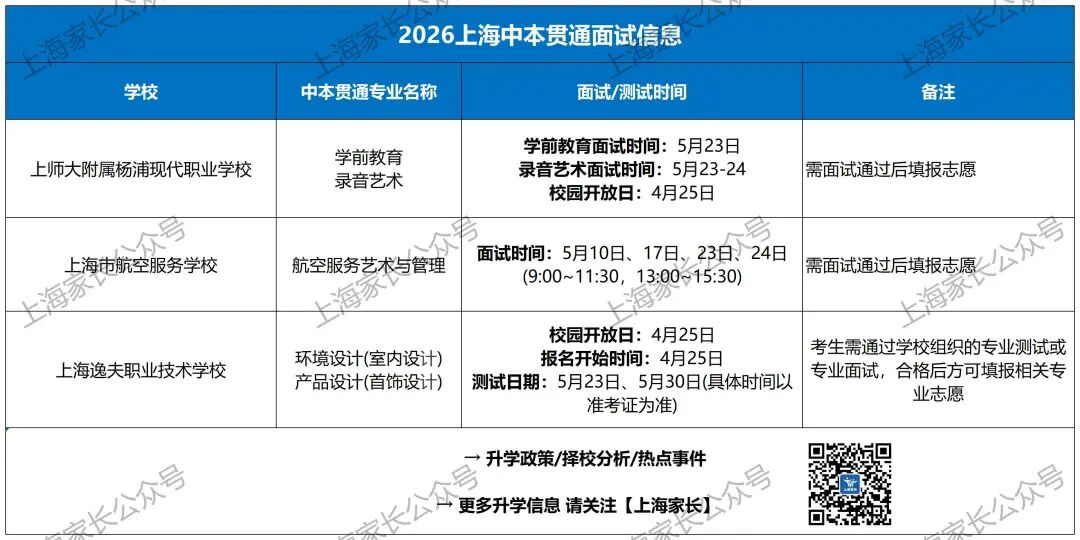 最近上海中职校提前批招生简章陆续发布中,根据学校的招生简章,部分学校的中本贯通、中高职贯通专业是要面试的(考生需通过学校组织的专业测试或专业面试,合格后方可填报相关专业志愿);大家可以去相关中职校的官网或者官微报名!!