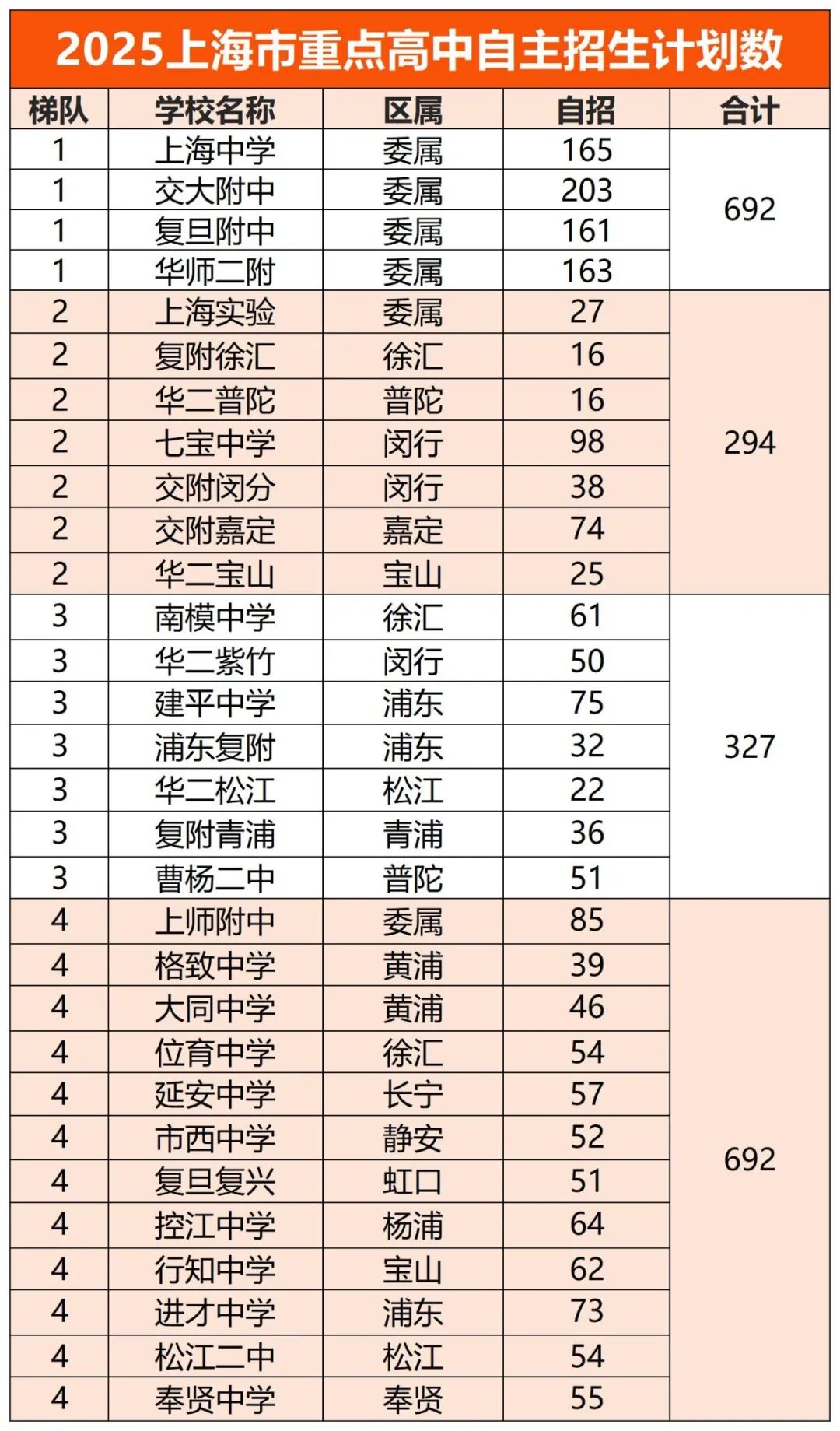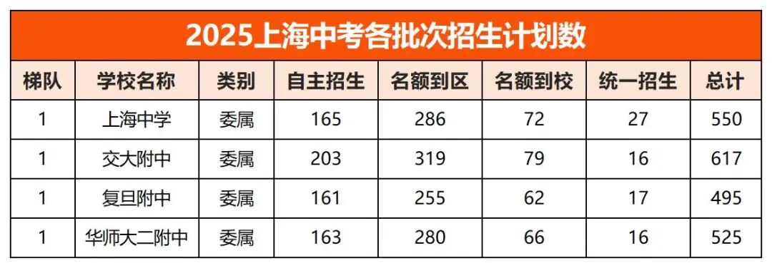 从录取人数及比例来看,上岸难度总体排序为上实>上外附中>浦外。 很多没能上岸家长问我们:“老师,孩子想进市重点,中考裸考行不行?” 往年的升学数据告诉你,行但也约等于不行。 为什么?从表格里我们可以看到: 统招约占四校总招生人数的3%,竞争及其激烈,能通过这条赛道走上来的往往都是卷王中的战斗机、几乎不扣分星人,是一条艰苦且狭窄的道路。 平行志愿和名额到区是裸考娃上四校的唯二路径,不过每个区的到区数量、分数线会差很多,需要仔细斟酌选区问题,对家长的考验很大,而且没有额外努力的机会。 名额到校基本不用看,因为"委属学校"的名额需要靠校长"抽签"。 因此,自招成为了理科娃必须要拼的一条路。 2025年T1~T4市重点高中自招名额一共2005个,如果小升初阶段没有上岸一线理科班(一届400+人),依然有很多名额可以获得,是非常值得努力的目标。