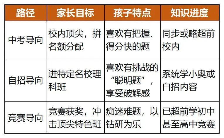 根据出口目标倒推,结合孩子的特点,可以把孩子大致分为三类,中考导向、自招导向和竞赛导向: